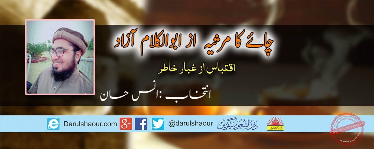 وقت وہی ہے مگر افسوس! وہ چائے نہیں ہے جو طبعِ شورش پسند کو سرمستیوں کی اور فکرِ عالَمِ آشوب کو آسودگیوں کی دعوت دیا کرتی تھی۔ وہ چینی چائے جس کا عادی تھا، کئی دن ہوئے ختم ہوگئی اور احمد نگر اور پونا کے بازاروں میں کوئی اس جنس گراں مایہ سے آشنا نہیں، مجبوراً ہندوستان کی اسی سیاہ پتّی کا جوشاندہ پی رہا ہوں جسے تعبیر و تسمیہ کے اس قاعدے کے بموجب لوگ چائے کے نام سے پُکارتے ہیں اور دودھ ڈال کر اس کا گرم شربت بنایا کرتے ہیں۔